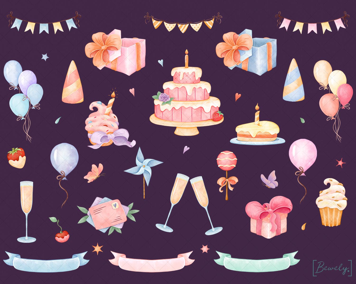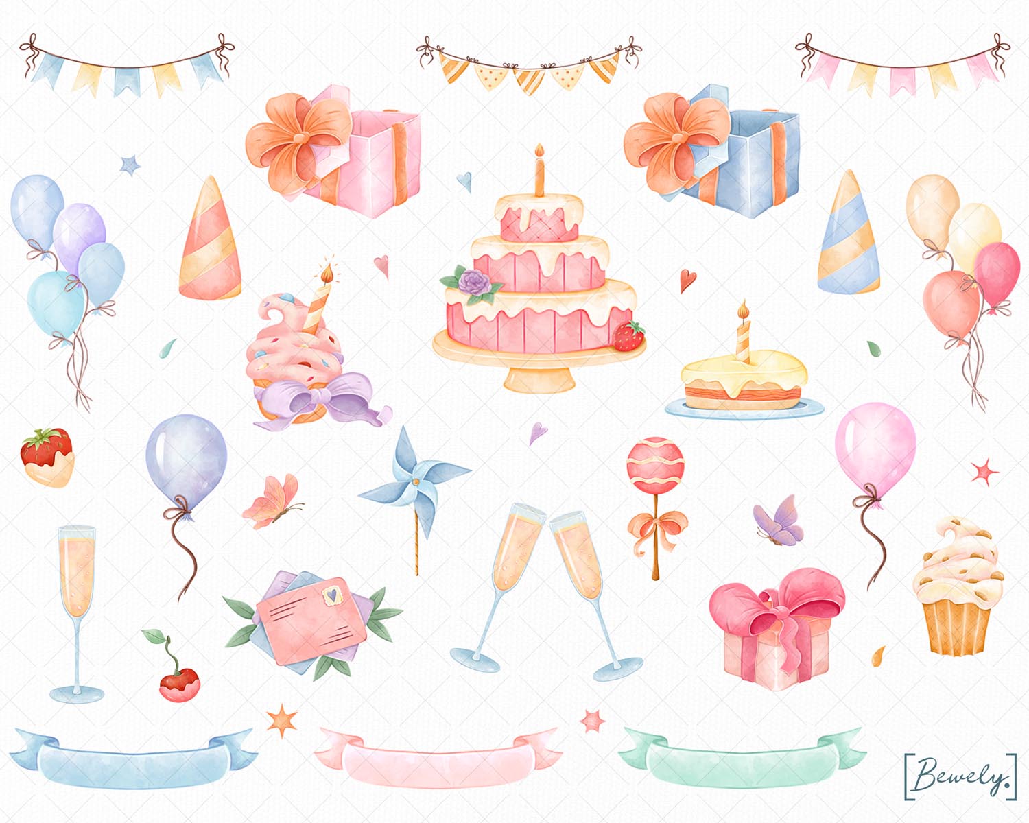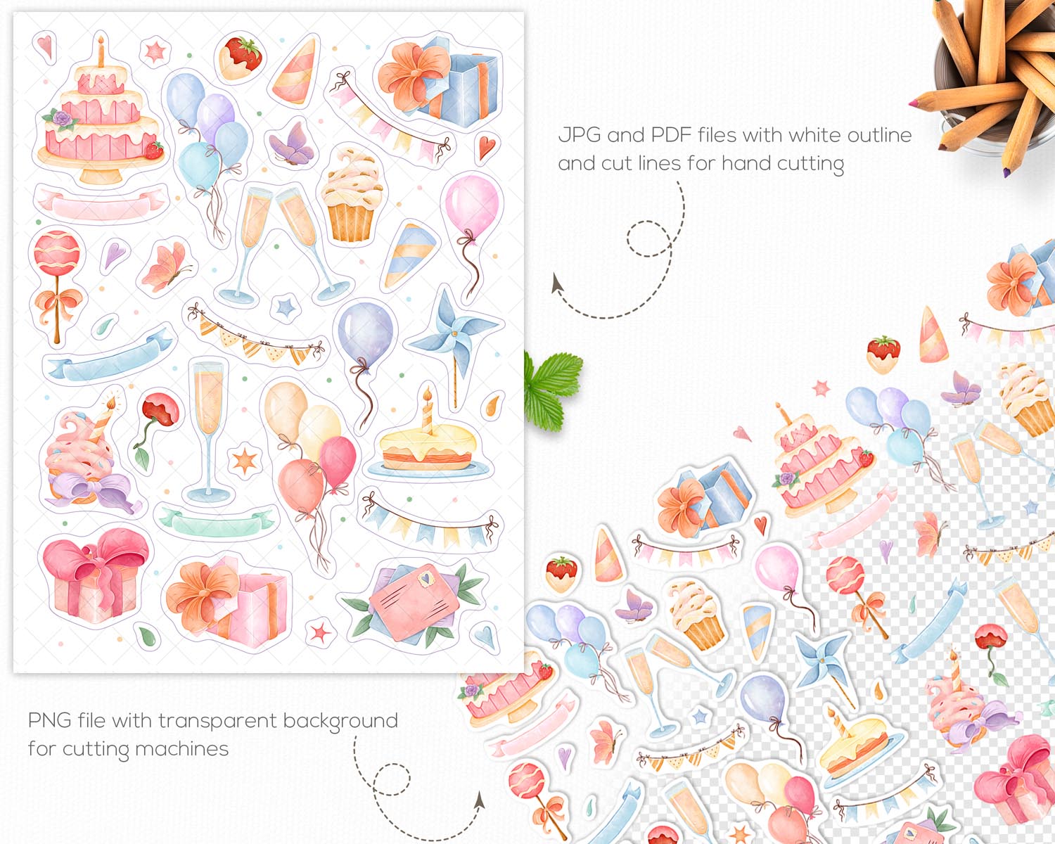 39 unique birthday and party clipart elements per sheet