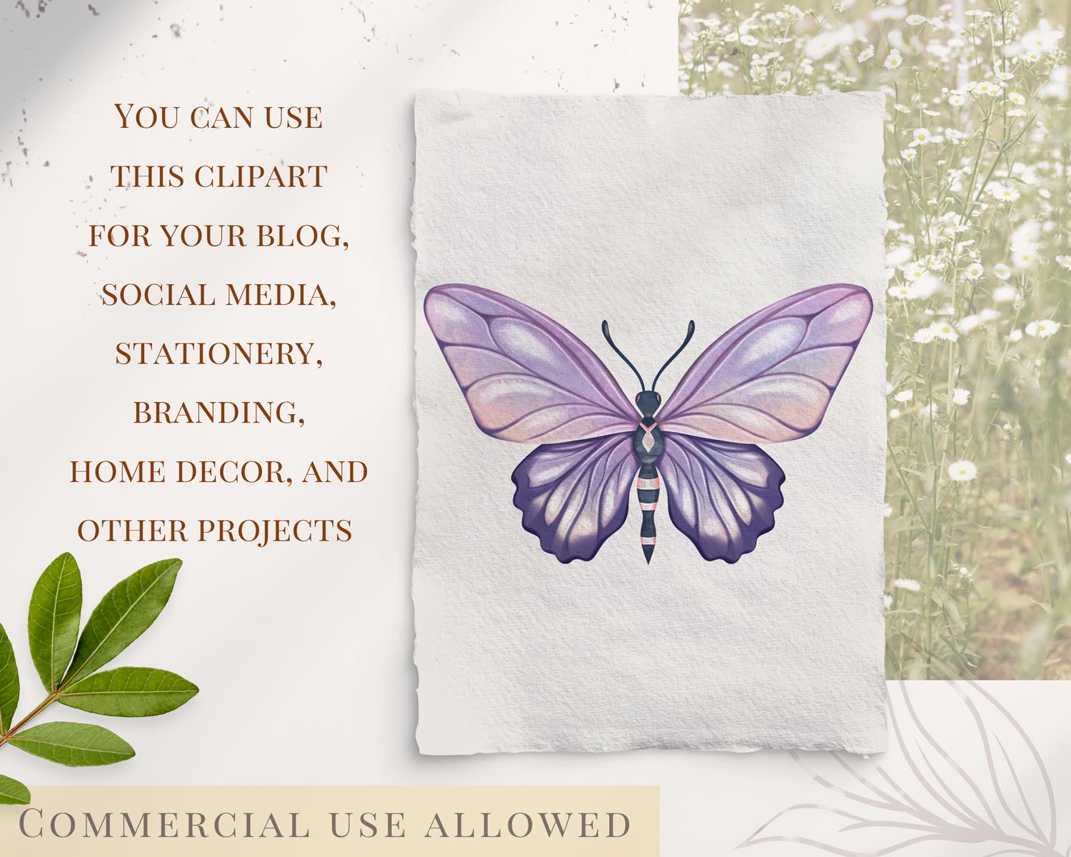 The bright summer butterfly PNG files are especially great for DIY printable stickers. Simply arrange the elements on one page, print on sticker paper, and cut them by hand or with a cutting machine. Use them to decorate planners, notebooks, laptops, children’s crafts, gift wrapping, envelopes, or room décor.