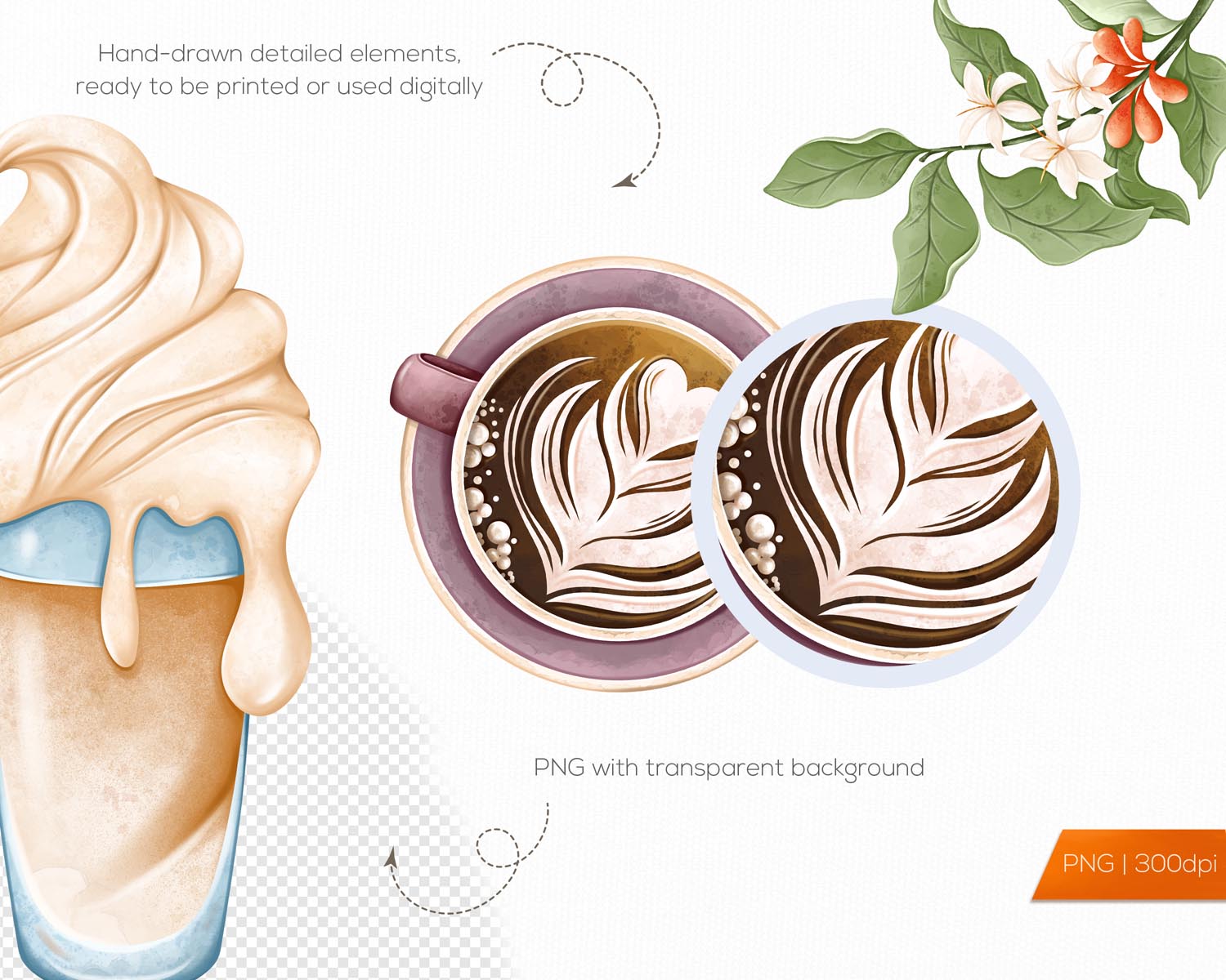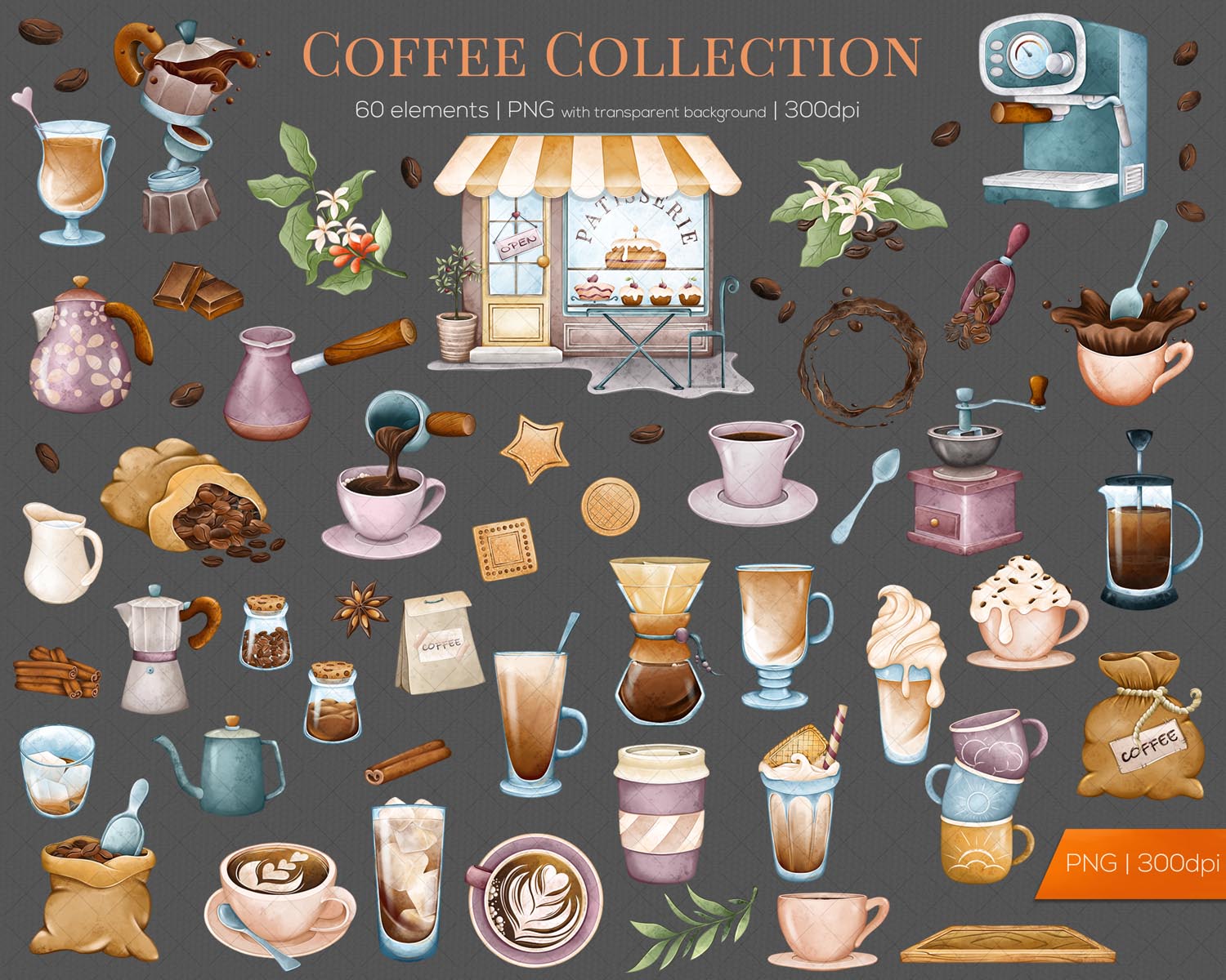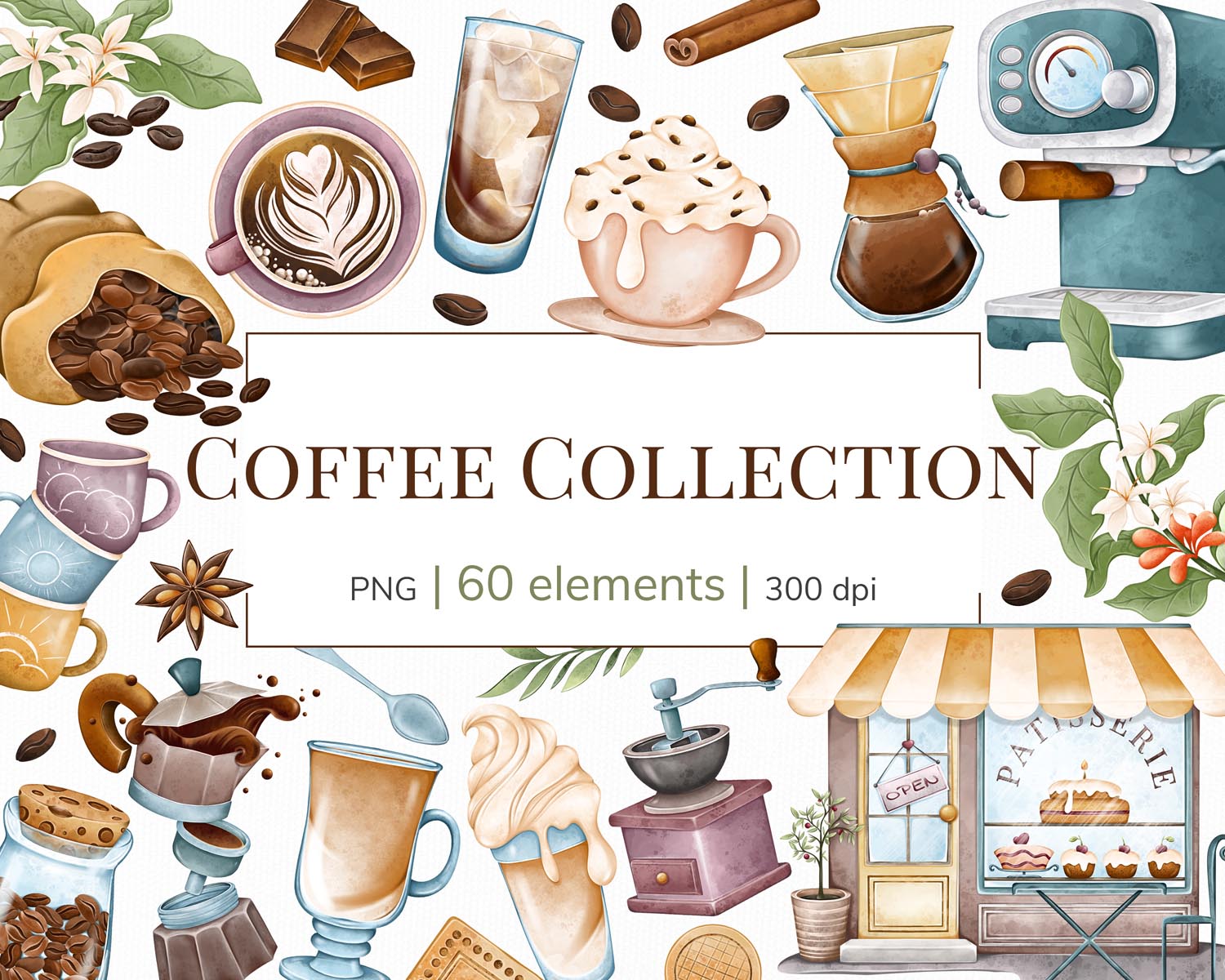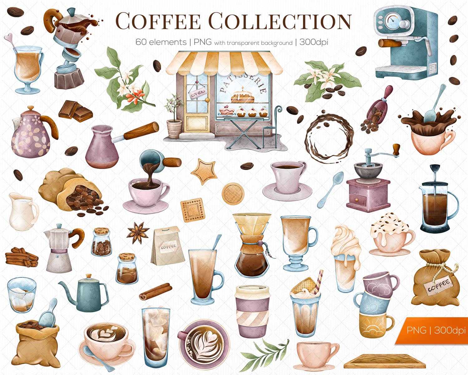 Coffee Clipart is a 60-piece hand-drawn watercolor PNG set featuring coffee drinks, mugs, beans, and café elements—perfect for stickers, planners, sublimation, and cozy coffee-themed print or digital projects.