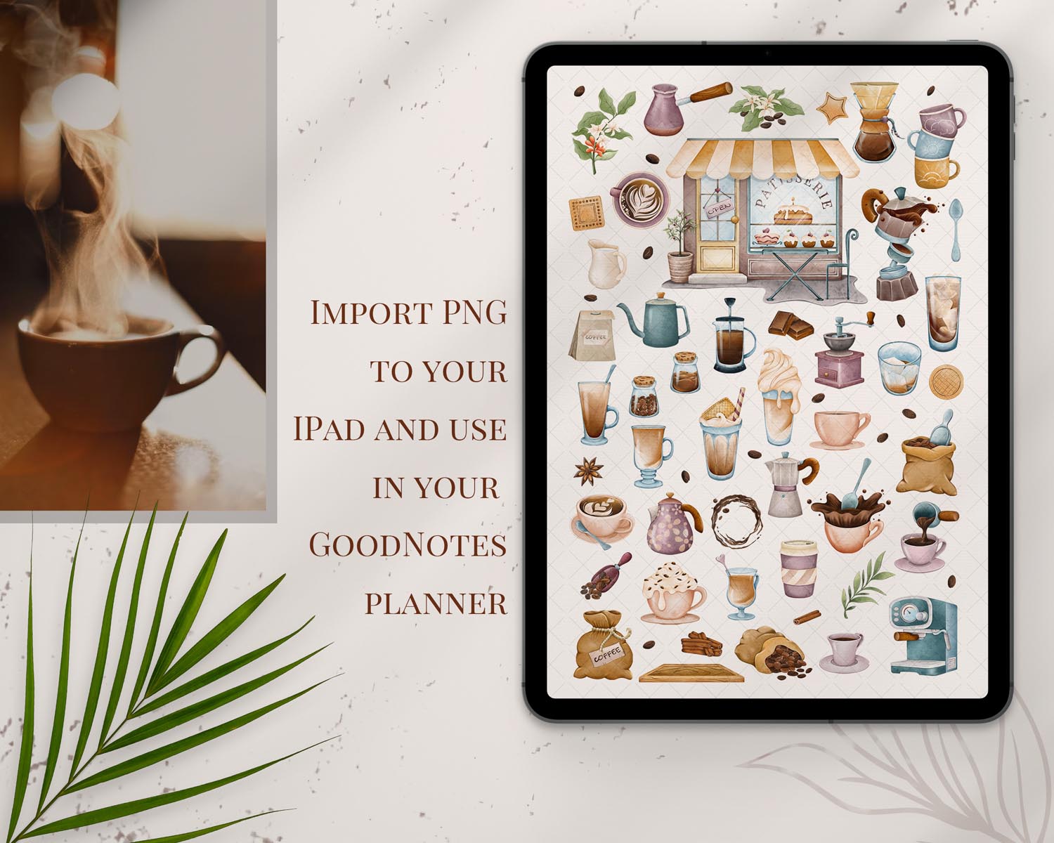 You can also use these illustrations as digital stickers in GoodNotes or any other digital planning app. Just unzip the files in your Dropbox and insert the elements directly onto your planner pages for a cozy, café-inspired look.