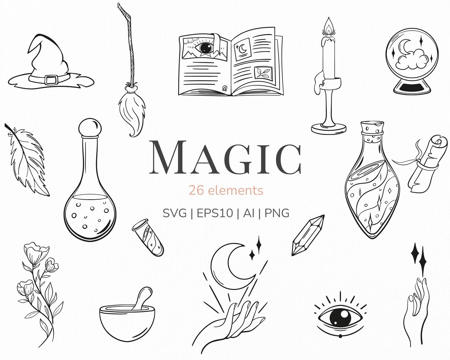 - 26 assorted hand-drawn mystical and witchcraft elements (black & white)