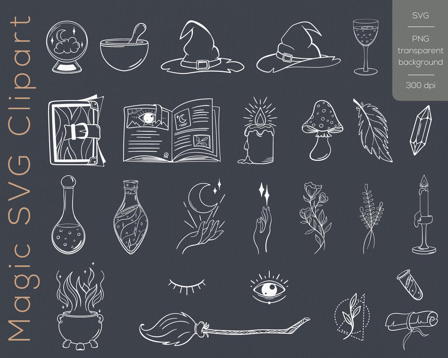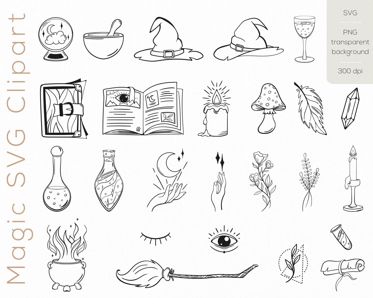 Mystical SVG Clipart is a beautifully detailed digital instant download collection of 26 hand-drawn vector elements, inspired by witchcraft, magic symbolism, floral accents, and boho aesthetics. Designed in elegant black and white line art style, this bundle is perfect for logo creation, branding, sublimation projects, and Cricut crafts.