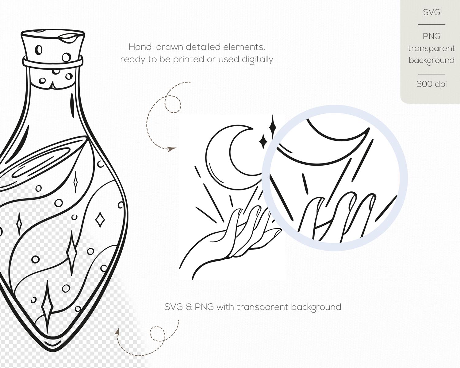 Each element is carefully hand-drawn to give your designs a unique, artistic, and slightly mystical character. Whether you’re creating witchcraft-themed merchandise or elegant celestial branding, this bundle gives you flexible, professional-quality vector files for unlimited creative possibilities.