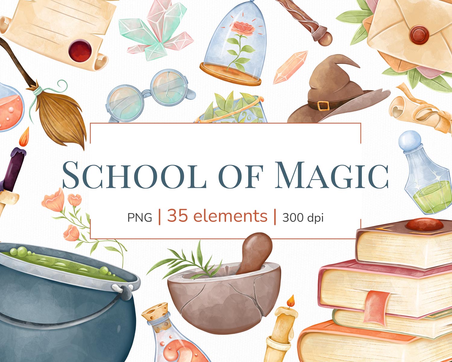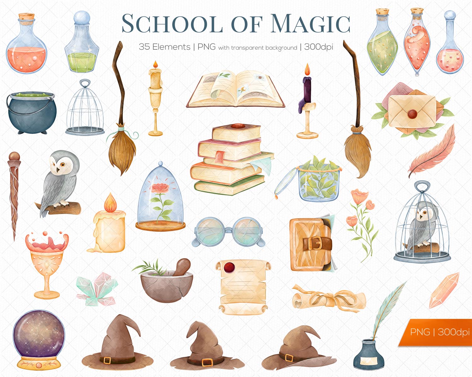 This witchcraft and magic school clipart set is perfect for creating sale flyers, study materials, postcards, party invitations, greeting cards, scrapbooking pages, and handmade gifts for family and friends. It also works beautifully for digital projects such as website graphics, blogs, social media banners, presentations, and digital planners.