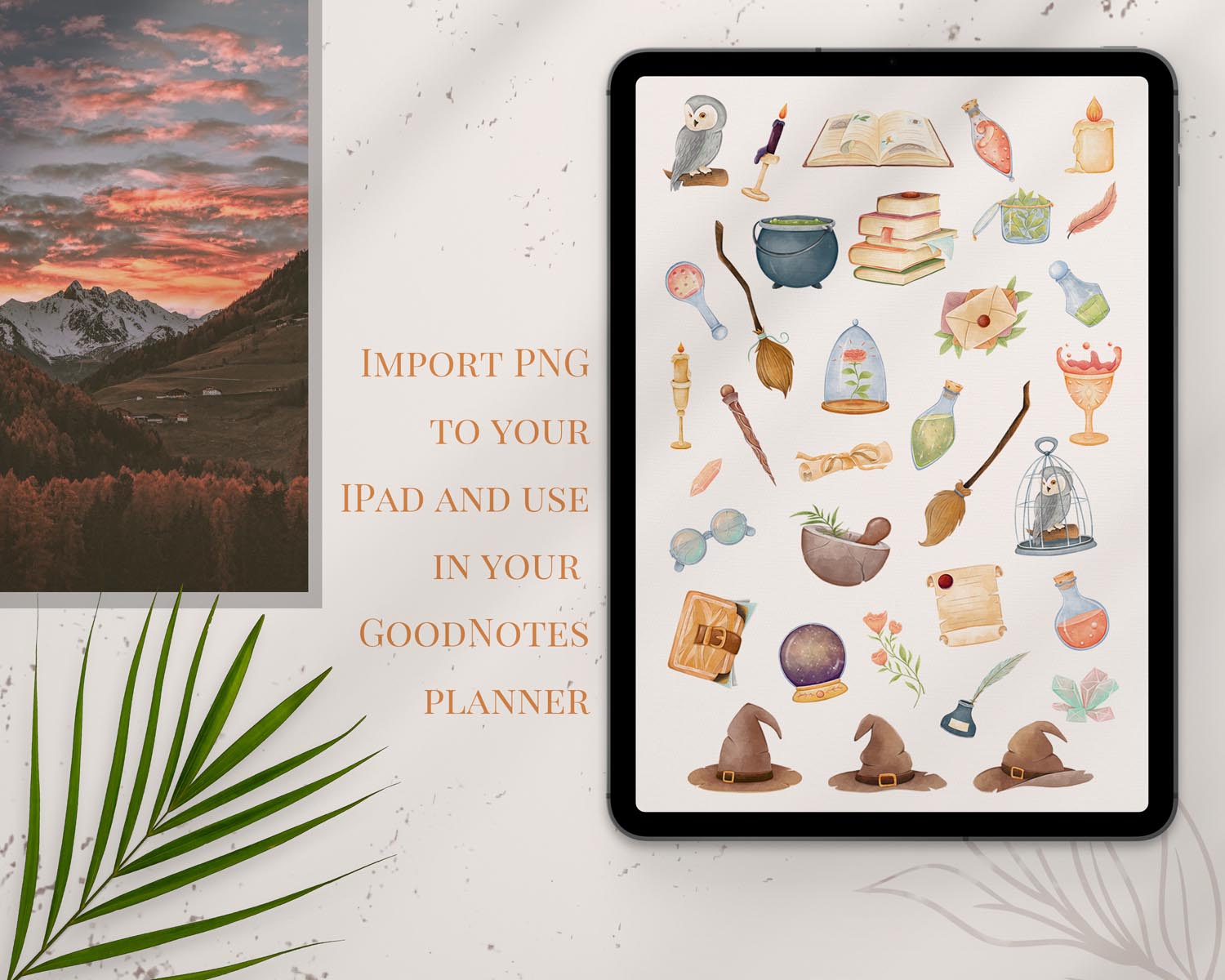 You can also use these illustrations as digital stickers in GoodNotes or any other digital planning app. Just unzip the files in your Dropbox and insert the elements directly onto your planner pages for a whimsical, magical look.