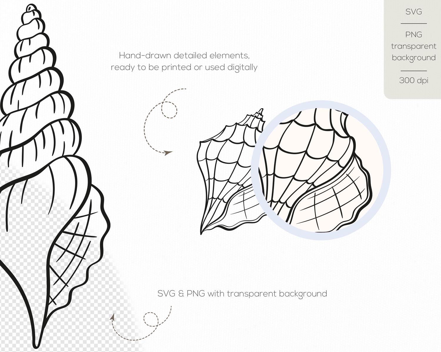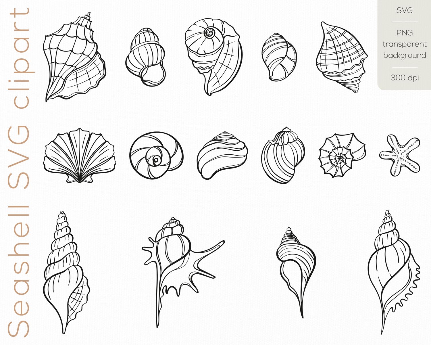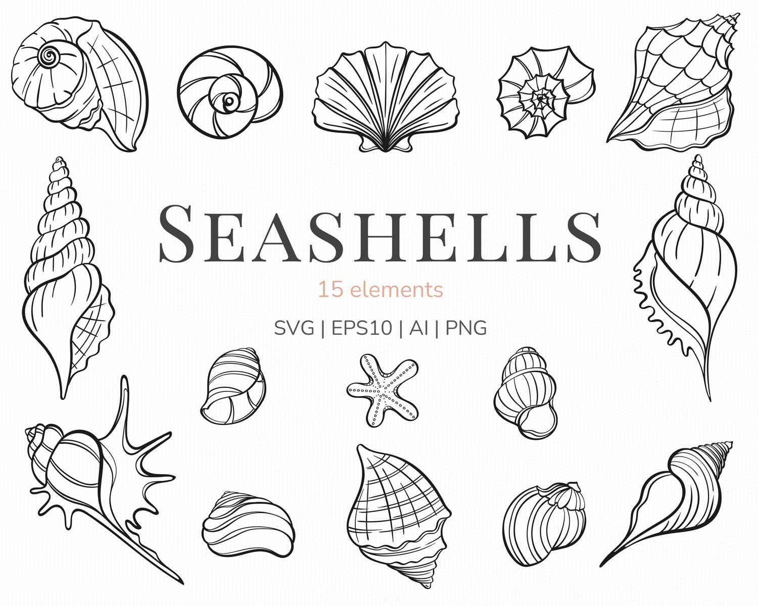 This instant download includes 15 hand-drawn seashell elements, carefully prepared for maximum versatility: