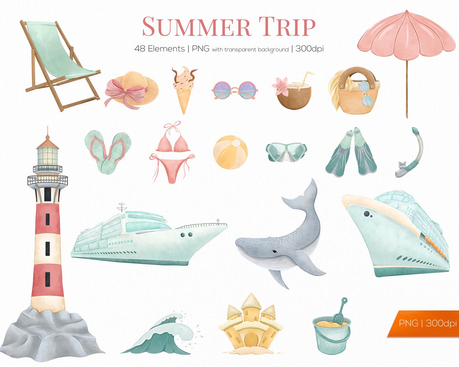 Beach & Travel Clipart is a 47-piece hand-drawn summer vacation PNG bundle with transparent backgrounds, perfect for stickers, planners, sublimation, and sunny digital or print projects.
